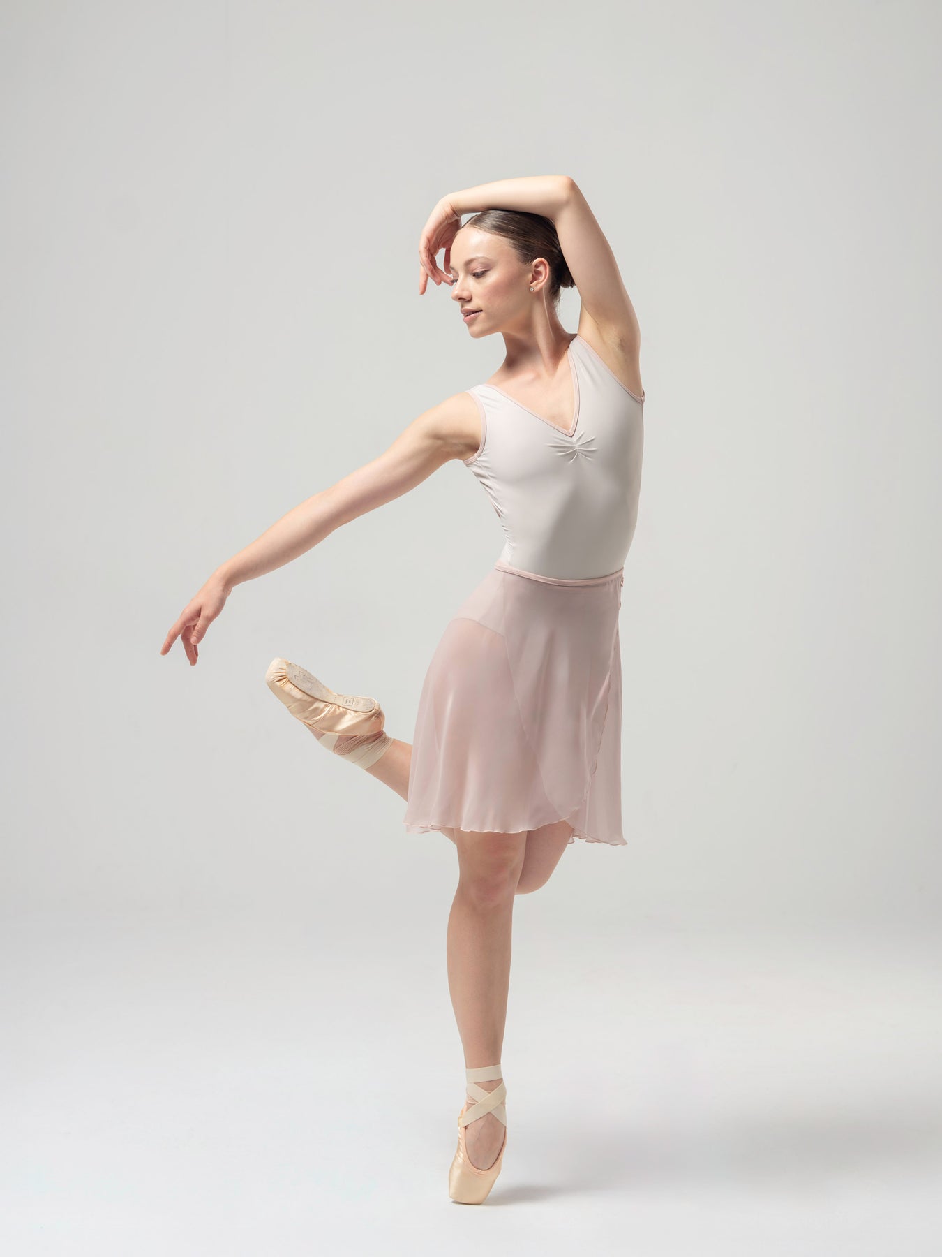 The Brisa leotard blends soft performance fabric with a sculpted silhouette. The V-neckline and pinch front detail are complemented by a high leg cut, creating a sleek line for any technical routine.